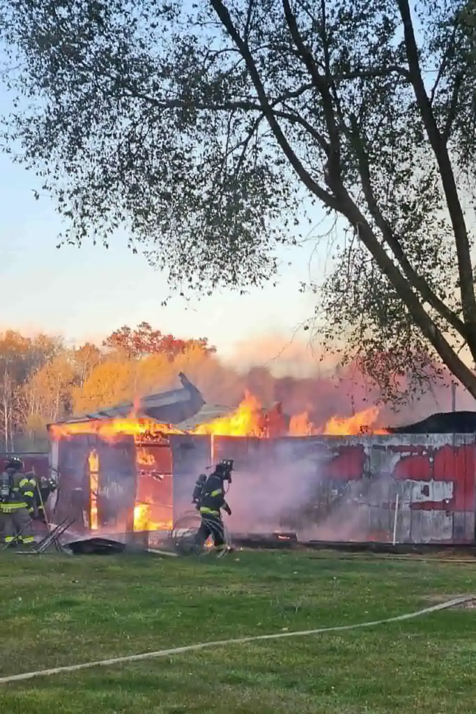 When firefighters arrived on scene, a 40’ x 70’ metal-sided barn was fully involved with two vehicles also on fire. The property is owned by Tracy Wilkie of Sheridan, according to Montcalm County property tax records.
