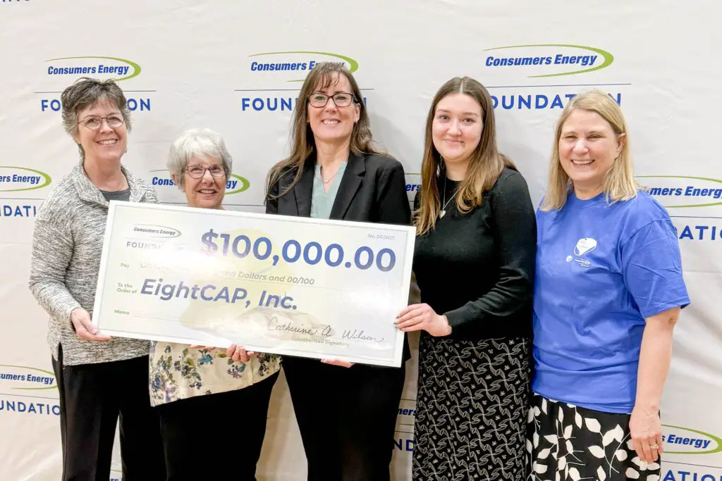 During the event, Lori Johnson, president of EightCAP, received the check from Consumers Energy Foundation representatives, including Cathy Wilson, secretary and treasurer of the Foundation, and Rebecca O’Connell, Consumers Energy community affairs manager.